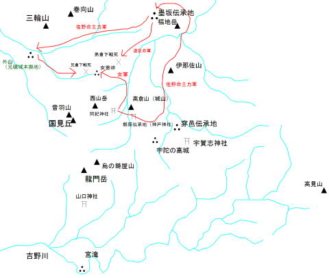 佐野命軍としてはまず、墨坂の弟倉下軍を壊滅させねばならなかった。墨坂が落ちれば忍坂を通って大和にはいることができる。そうすれば、三輪の弟磯城軍の協力を得て兄磯城軍を壊滅させることができるのである。